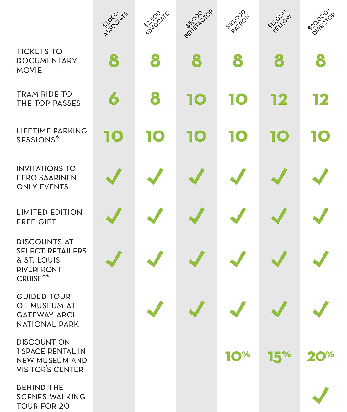 Eero Saarinen Society members are key partners in sustaining Gateway Arch National Park by providing significant funding through unrestricted gifts of $1,000 or more annually to support the mission and work of Gateway Arch Park Foundation. Their generous investment enables us to fulfill our mission of conservation, education, and community engagement. As an Eero Saarinen Society member, you join a generous group of supporters dedicated to keeping the Gateway Arch the iconic monument and park it is both now and for generations to come.