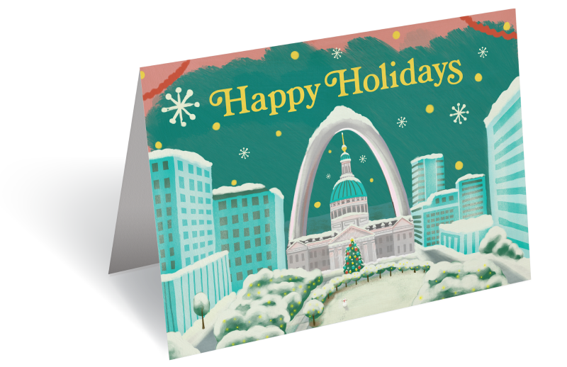 Featuring a beautiful illustration of the Gateway Arch and Old Courthouse, these cards capture the spirit and beauty of the Winter season in Downtown St. Louis.