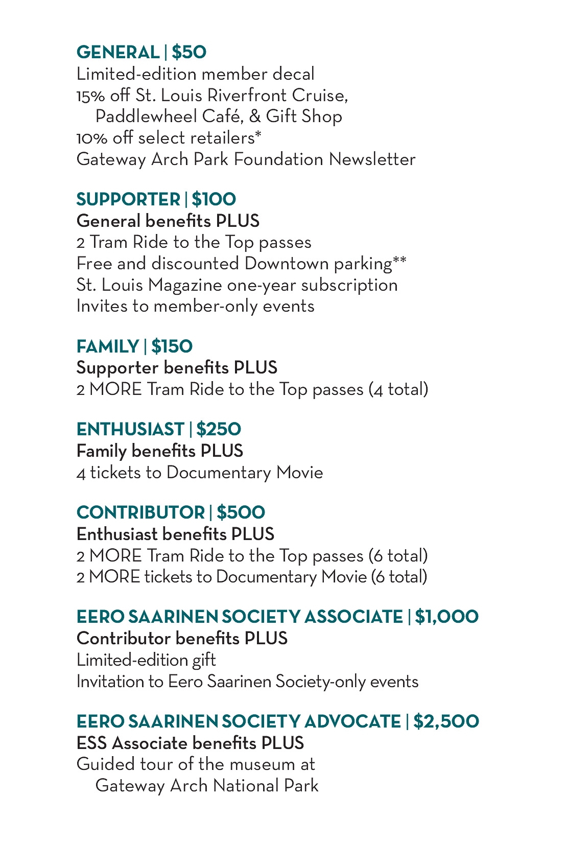 Benefits provided by Gateway Arch Park Foundation, Arch Café, Bi-State Development, Interpark, and Jefferson National Parks Association (JNPA)