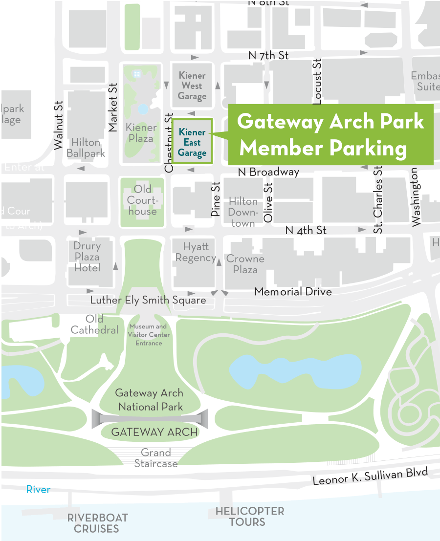 Interpark is the preferred parking provider for members of Gateway Arch Park Foundation. Members at the Supporter Level and above receive 10 free parks for Kiener East Parking Garage, just a few blocks away from the entrance of the Gateway Arch.