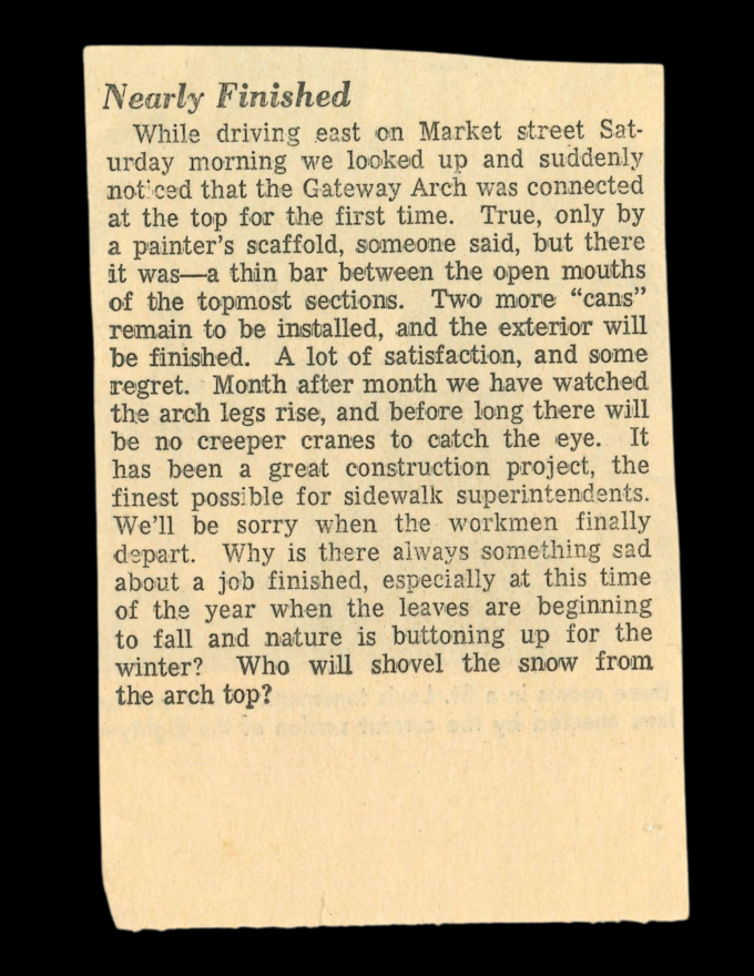 Before diving in, take a second to read the snippet below, published in the weeks leading up to October 28, 1965. Despite its unknown source, author, and exact publication date, the sentiment is especially powerful in capturing the everyday local's thoughts ahead of the last piece being set in place. 60 years later, we can offer a response to some of these musings- those very workmen are returning to the site this weekend, the structure has stood tall through countless snowfalls and seasons changing, and St. Louis is still gazing up at our Gateway Arch in awe.