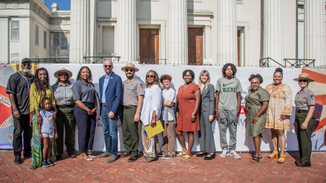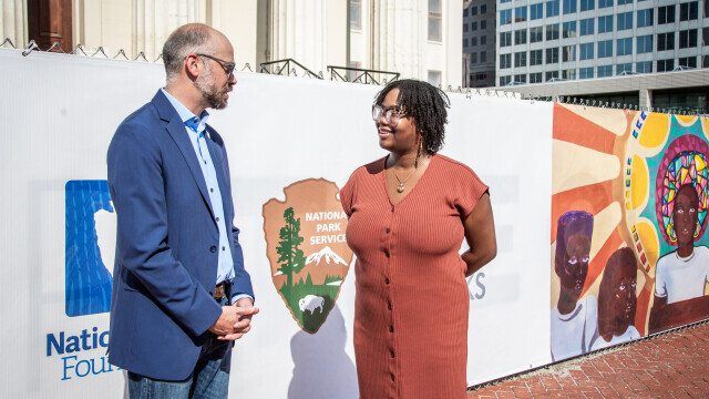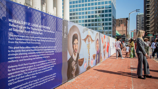 The Old Courthouse holds great historical significance for not only St. Louis, but also for our entire country. Although the building has been closed to the public for renovations, we still wanted to find a way for people to honor and engage with the Old Courthouse’s vast legacy. Thanks to a grant we received from the National Park Foundation’s Strong Parks, Strong Communities program, and a donation matching the grant by Gateway Arch Park Foundation donors, we were able to do just that. Gateway Arch Park Foundation commissioned a series of public art displays outside the Old Courthouse in partnership with the National Park Service and local community organization St. Louis ArtWorks, a nonprofit organization that provides underserved youth with art education, job skill training, and exposure to career opportunities through paid apprenticeships.