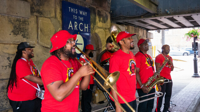 Undeterred by the rain and gloomy clouds, many attendees chose our “curbside pick-up” option and were greeted with delightful tunes by St. Louis favorite, the Red & Black Brass Band.